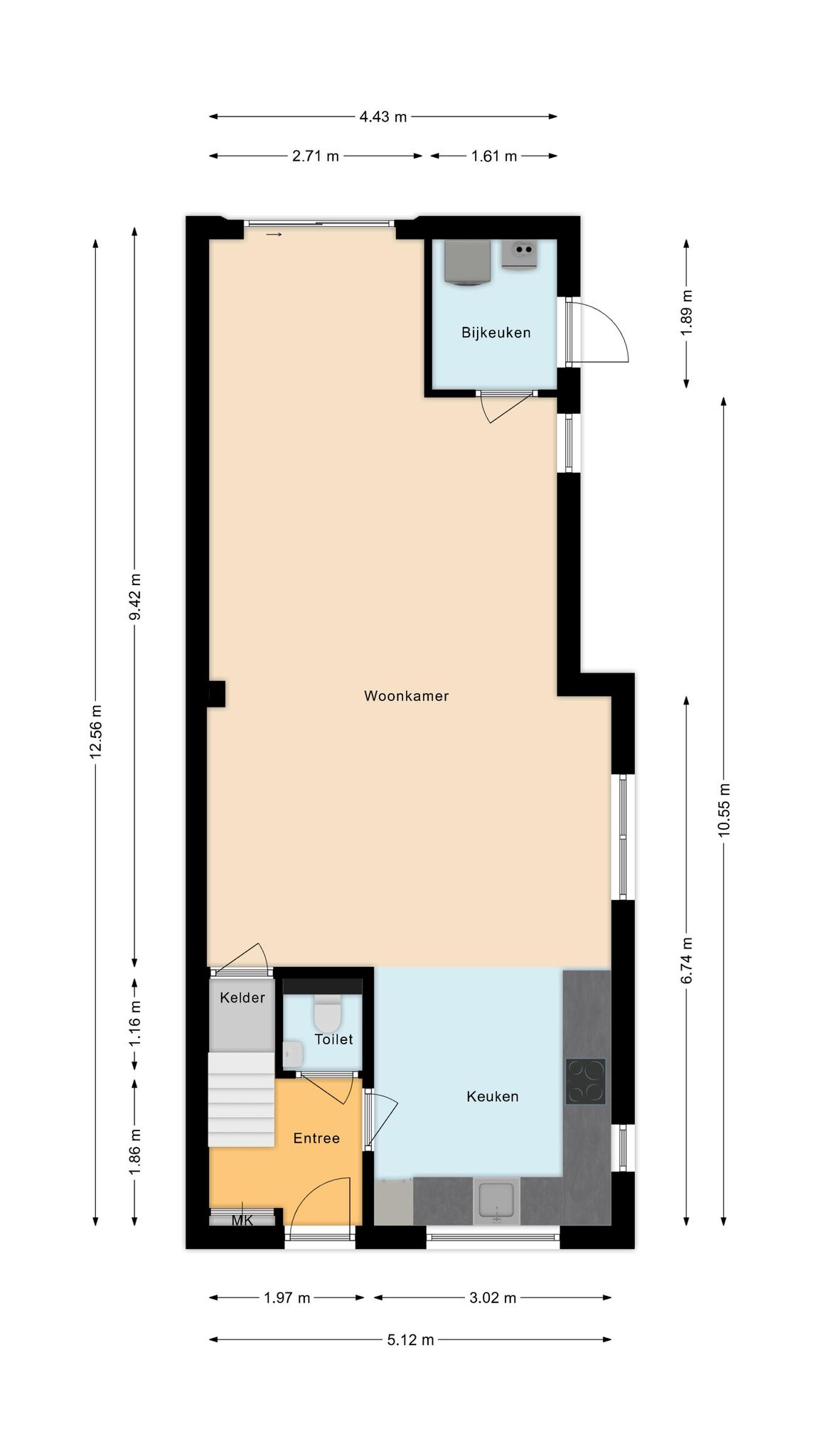 Begane grond o.a. hal/entree, toilet met fontein, meterkast en trapopgang;. Een zonnige, uitgebouwde woonkamer met tuindeuren naar buiten; een open keuken uit 2023 voorzien van diverse Siemens inbouwapparatuur; vanuit de woonkamer tevens toegang tot de bijkeuken met wasmachineaansluiting en achterom.