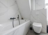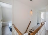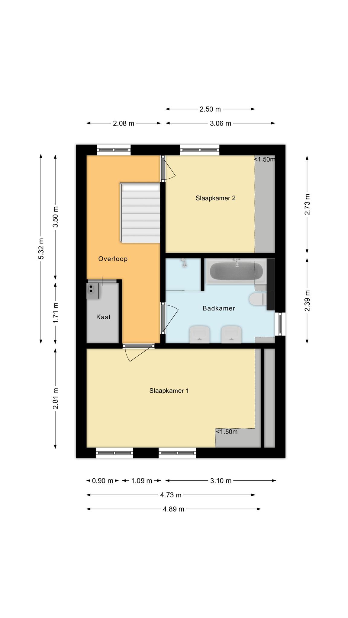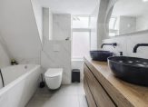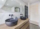 Op de eerste verdieping bevinden zich vaste opbergkasten op de overloop, twee slaapkamers en een badkamer die in 2022 volledig is gemoderniseerd. De badkamer is voorzien van een inloopdouche, ligbad, toilet en dubbele wastafel.