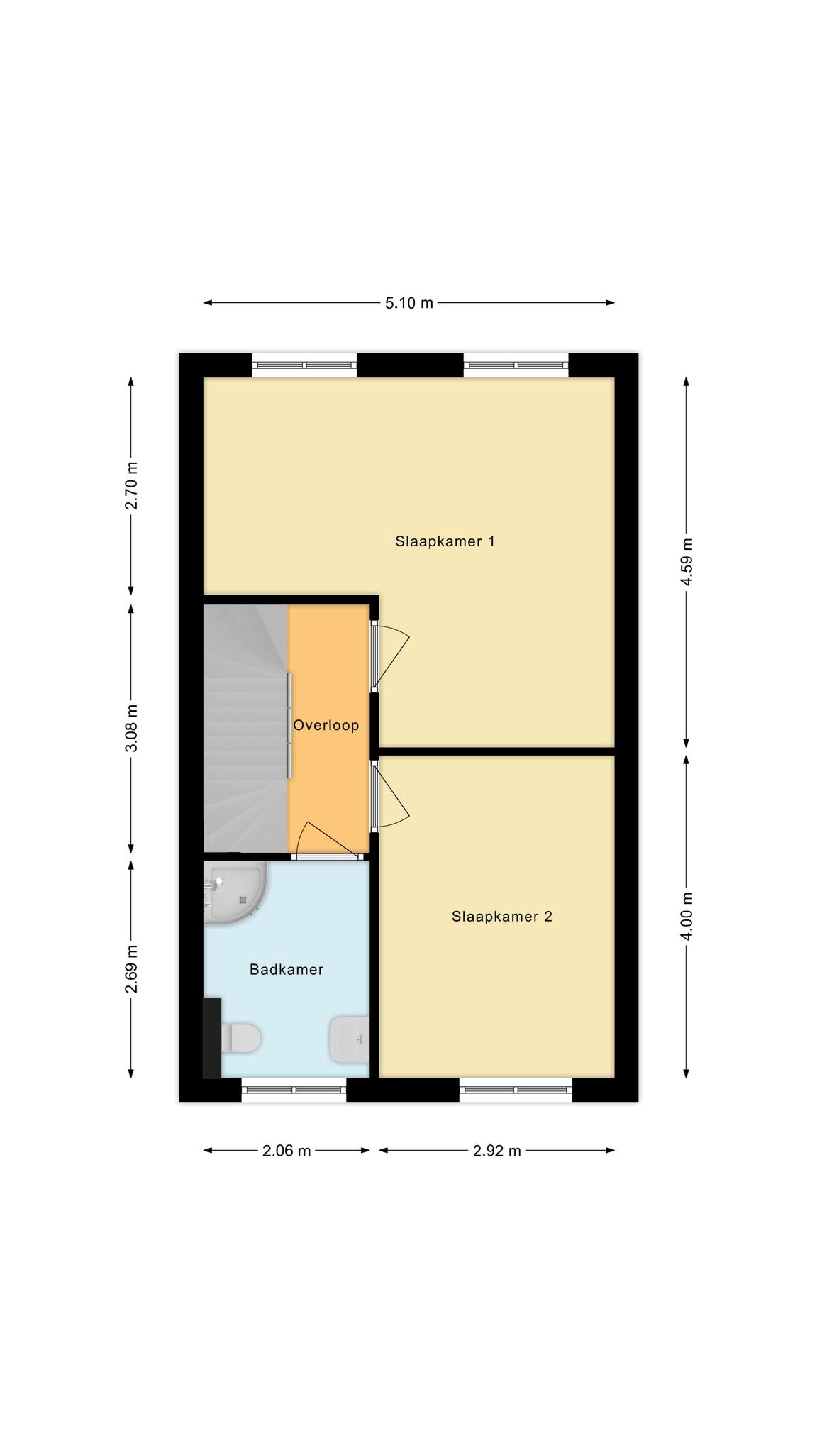 Op de verdieping de overloop en twee slaapkamers waarvan de hoofdslaapkamer opgesplitst kan worden in twee aparte kamers waardoor er drie slaapkamers op de verdieping ontstaan. De badkamer is verder praktisch ingedeeld en voorzien van een douchecabine, toilet, badmeubel en wastafel.