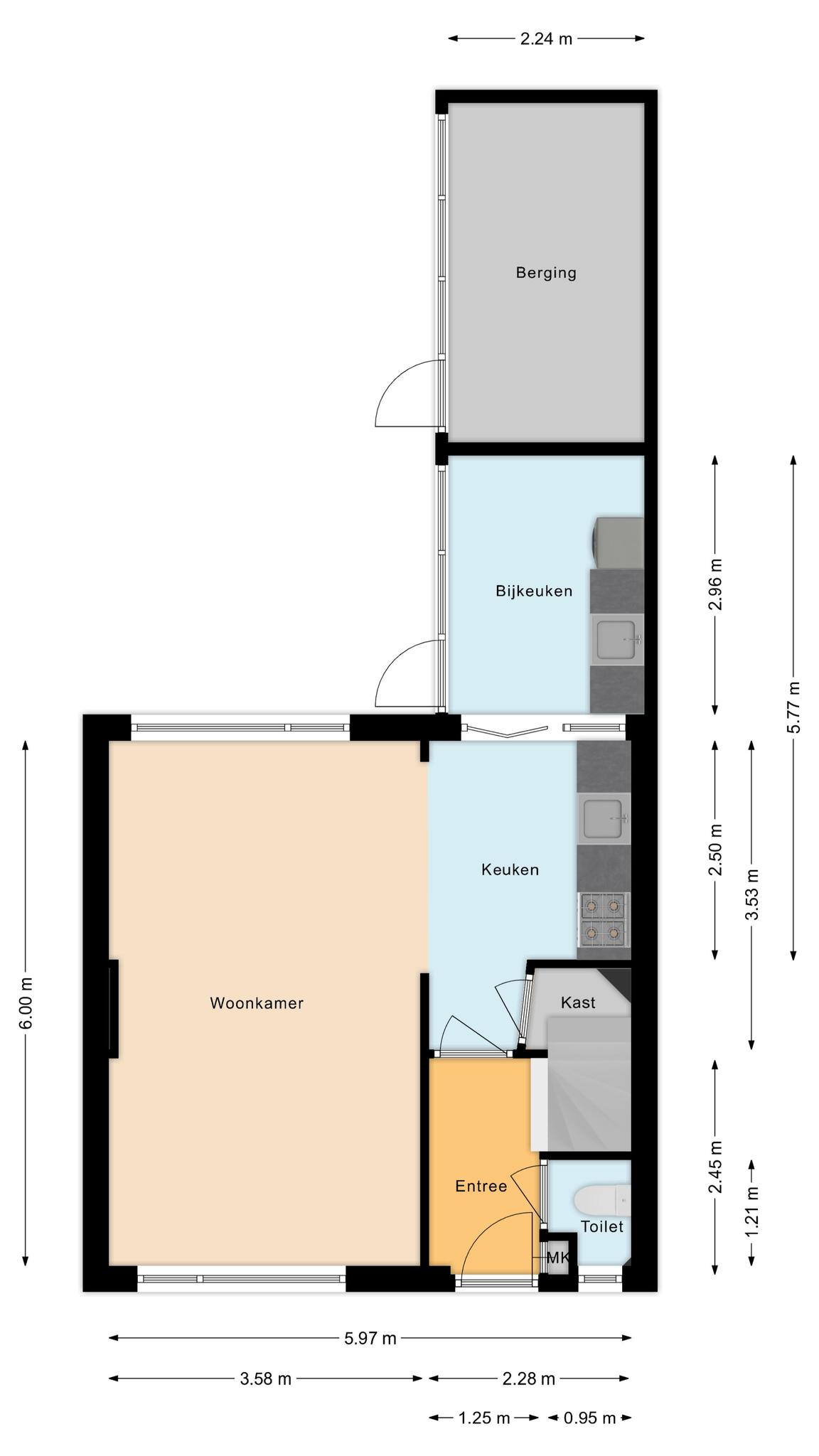 – Bijkeuken met provisiekast en achterom; de muur tussen de keuken en bijkeuken kan worden verwijderd, waardoor een open en moderne leefruimte ontstaat. Voor wie meer ruimte zoekt is er ook de mogelijkheid, om aan de achterzijde, uit te bouwen.