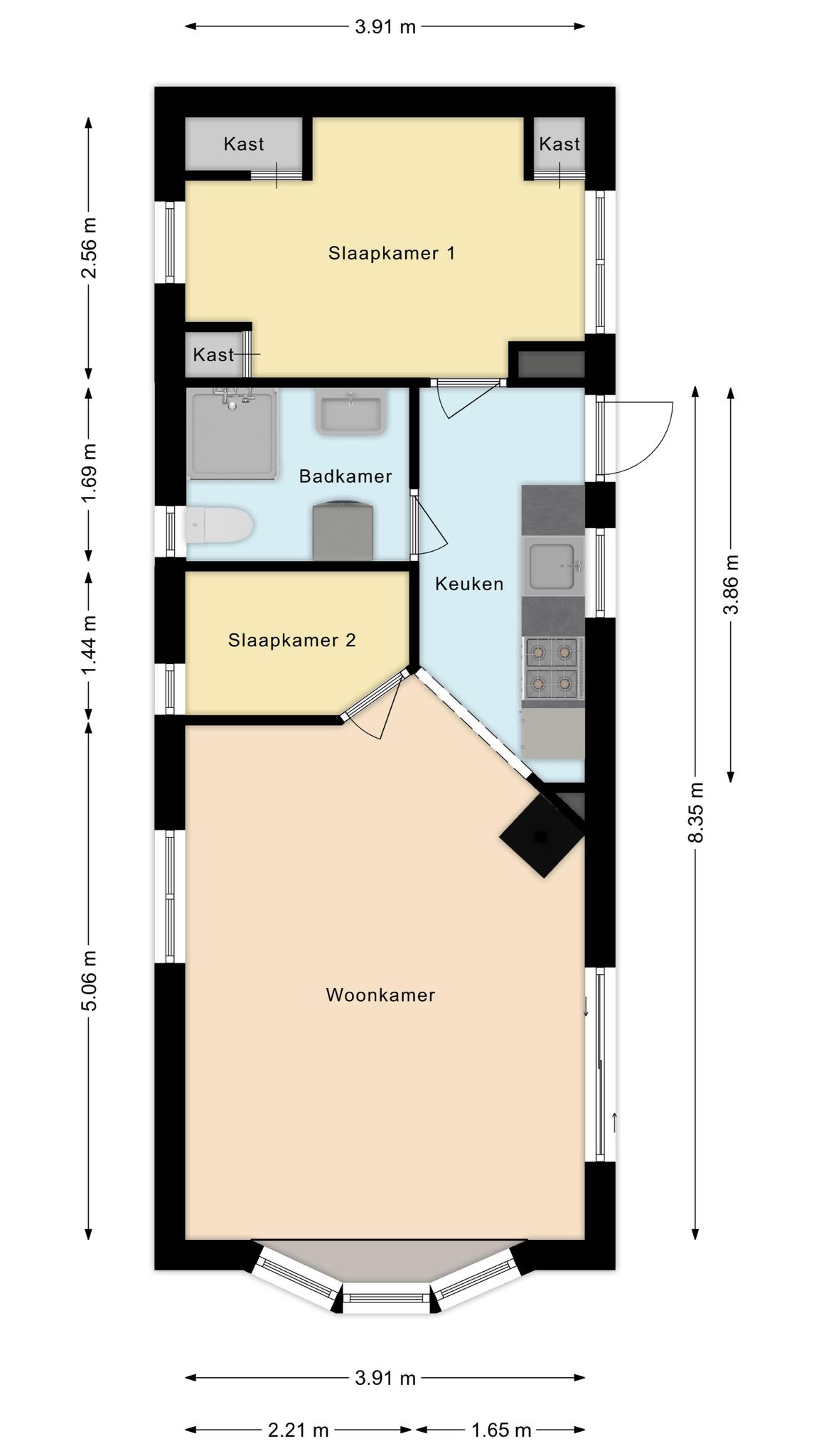 Entree via de keuken met neutraal keukenblok; woonkamer met pelletkachel, erker en schuifpui naar het terras; hoofdslaapkamer met vaste kasten; badkamer met douche, wastafel, toilet en wasmachineaansluiting; tenslotte de 2e slaapkamer.