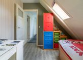 Op de verdieping de overloop, 5 slaapkamers en een badkamer met douche, wastafelmeubel en 2e toilet.
