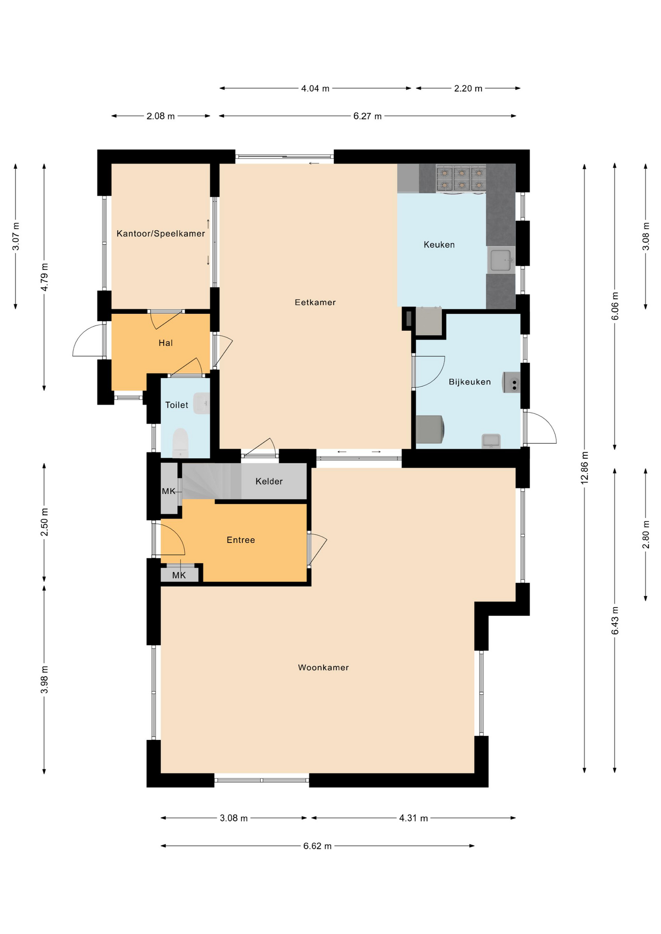 Op de begane grond een hal/entree met trapopgang, Z-vormige living met suitedeuren, woonkeuken met schuifpui naar het terras en een L-vormige keukenopstelling voorzien van diverse inbouwapparatuur, kelder, bijkeuken met wasmachine-opstelling en achterom, slaap-/werkkamer welke vanuit de woonkeuken bereikbaar is middels suitedeuren, hal met achterom en toegang tot het toilet.