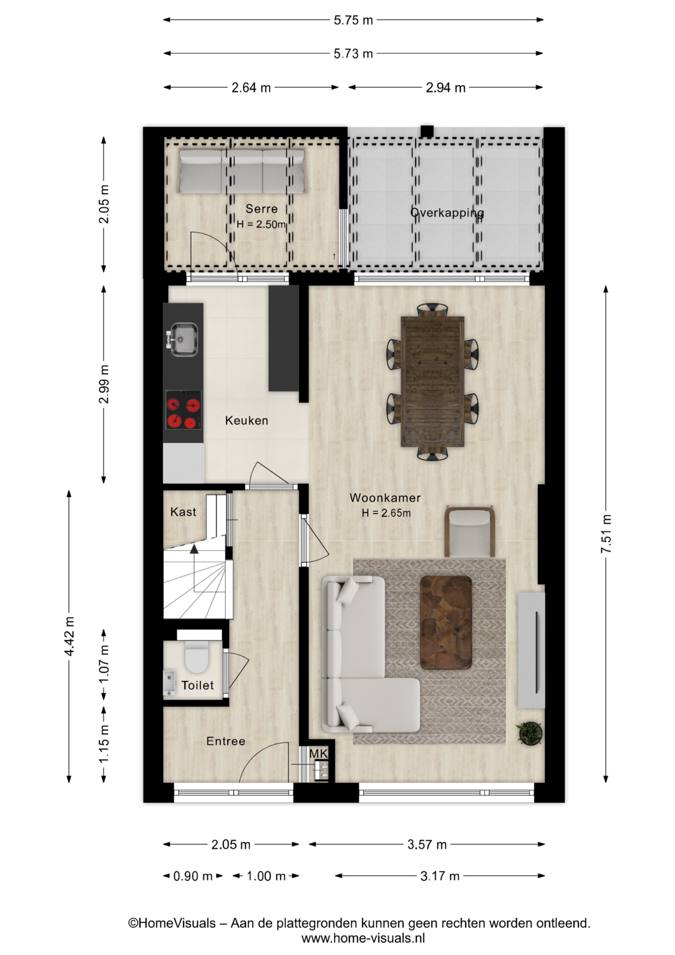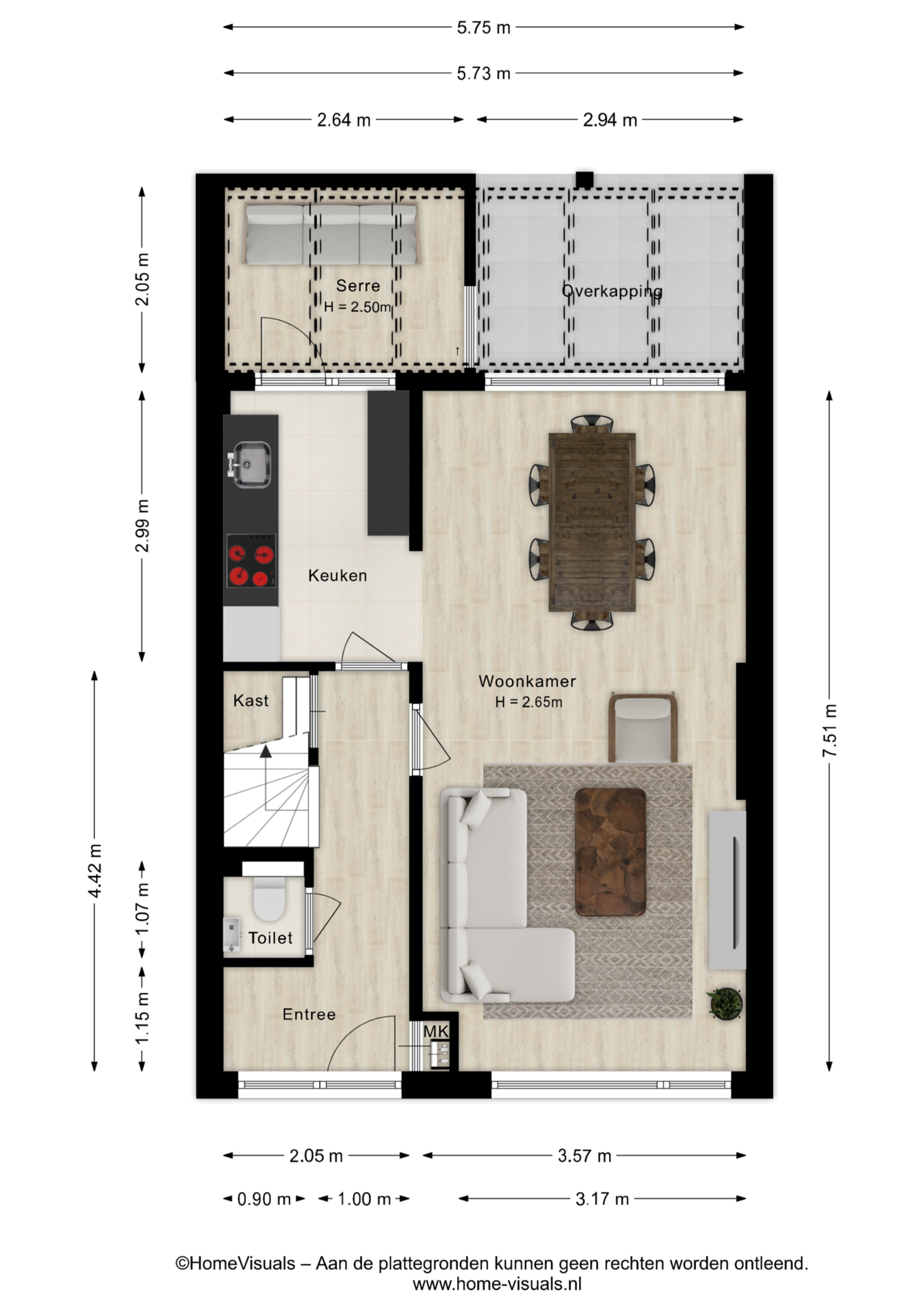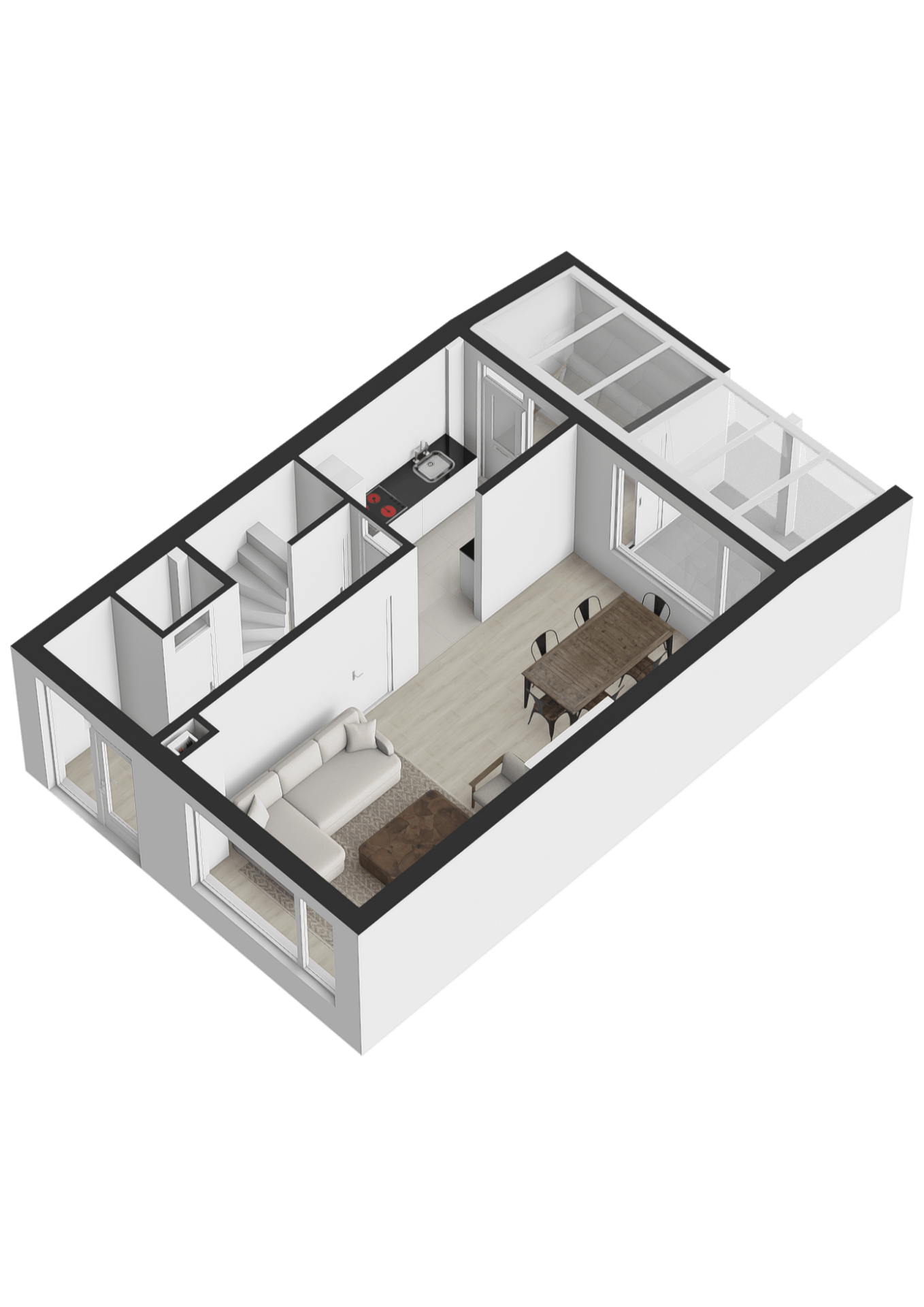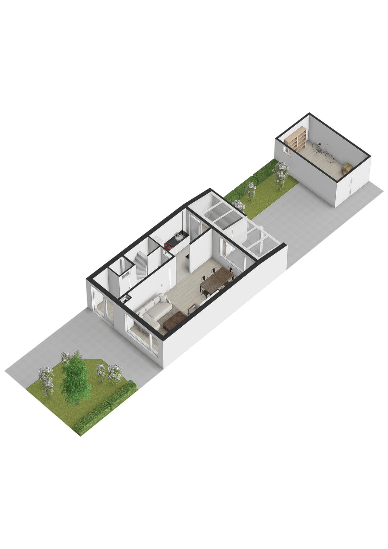Begane grond: Entree/hal, meterkast, hangtoilet met fontein, trapopgang, kelderkast. Doorzonwoonkamer. Keuken (soft-close) met inbouwapparatuur (o.a. koel-vriescombinatie, vaatwasser, combi-oven, inductiekookplaat, afzuigkap). Ten slotte het ‘klompenhokje’ met achterom.