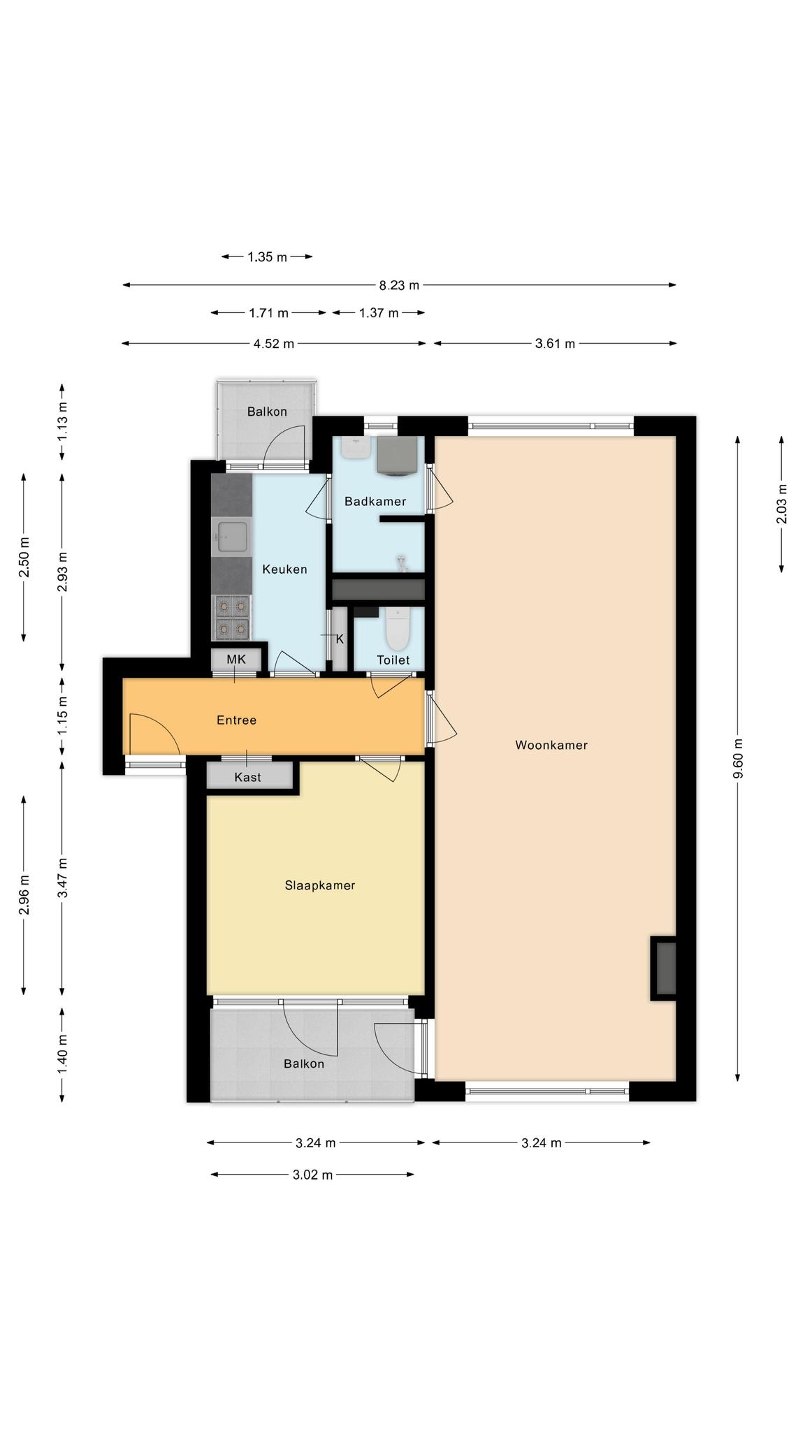 Entree/hal met een vaste kast en meterkast. Slaapkamer met toegang tot het balkon, gesloten keuken met een voorraadkast en toegang tot het tweede balkon. Vervolgens een badkamer met wastafel, douche en wasmachineaansluiting. Apart toilet en een woonkamer met toegang tot het balkon. De woonkamer biedt mogelijkheden tot het creëren van een tweede slaapkamer.