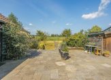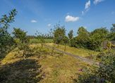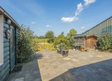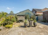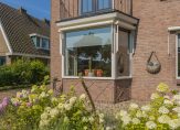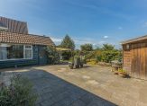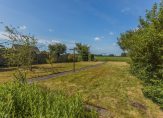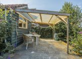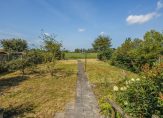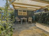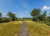De diepe achtertuin is gelegen op het westen en heeft prachtig uitzicht over de achtergelegen landerijen. Het is ingericht met diverse zitjes, borders met beplanting en een royaal gazon. In de achtertuin staat tevens een vrijstaand houten tuinhuis en een overkapping. Aan de voorkant heb je tevens een royale voortuin en parkeer je meerdere auto’s op eigen terrein.