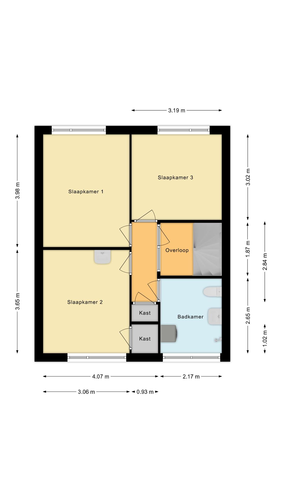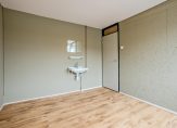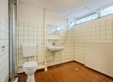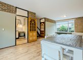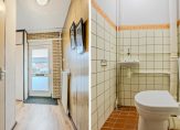 Op de verdieping een overloop met vaste kasten, drie slaapkamers, waarvan 2 met inbouwkasten, een 1 met wastafel; eenvoudige badkamer met wastafel, douche, 2e toilet en wasmachine aansluiting.
