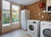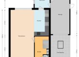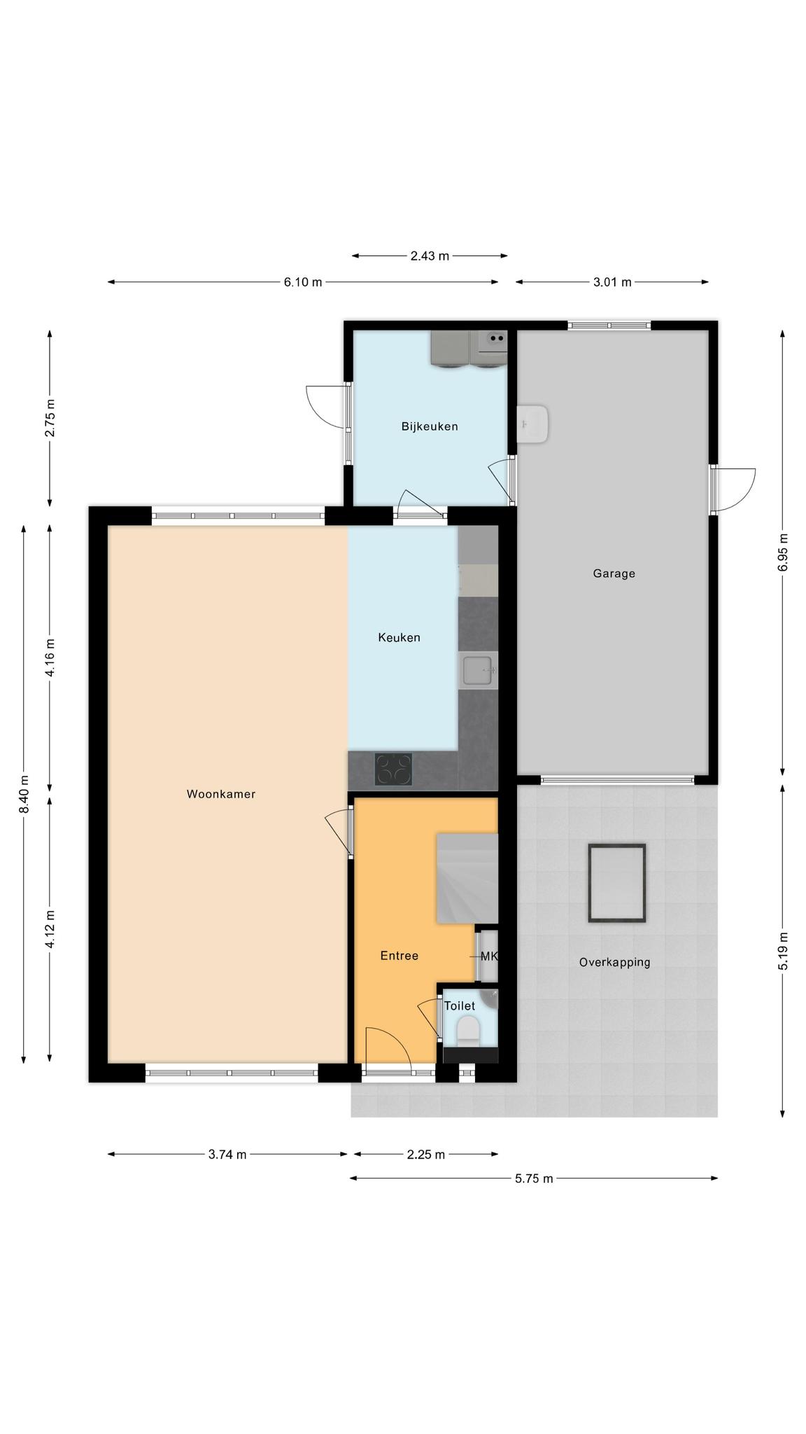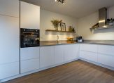 Op de begane grond de entree met toiletruimte, meterkast en trapopgang; ruime doorzonwoonkamer met een moderne, open keuken uit 2022 voorzien van hoekkeuken met diverse inbouwapparatuur; bijkeuken met aansluiting voor de wasmachine, achterom naar de tuin en deur naar de garage.