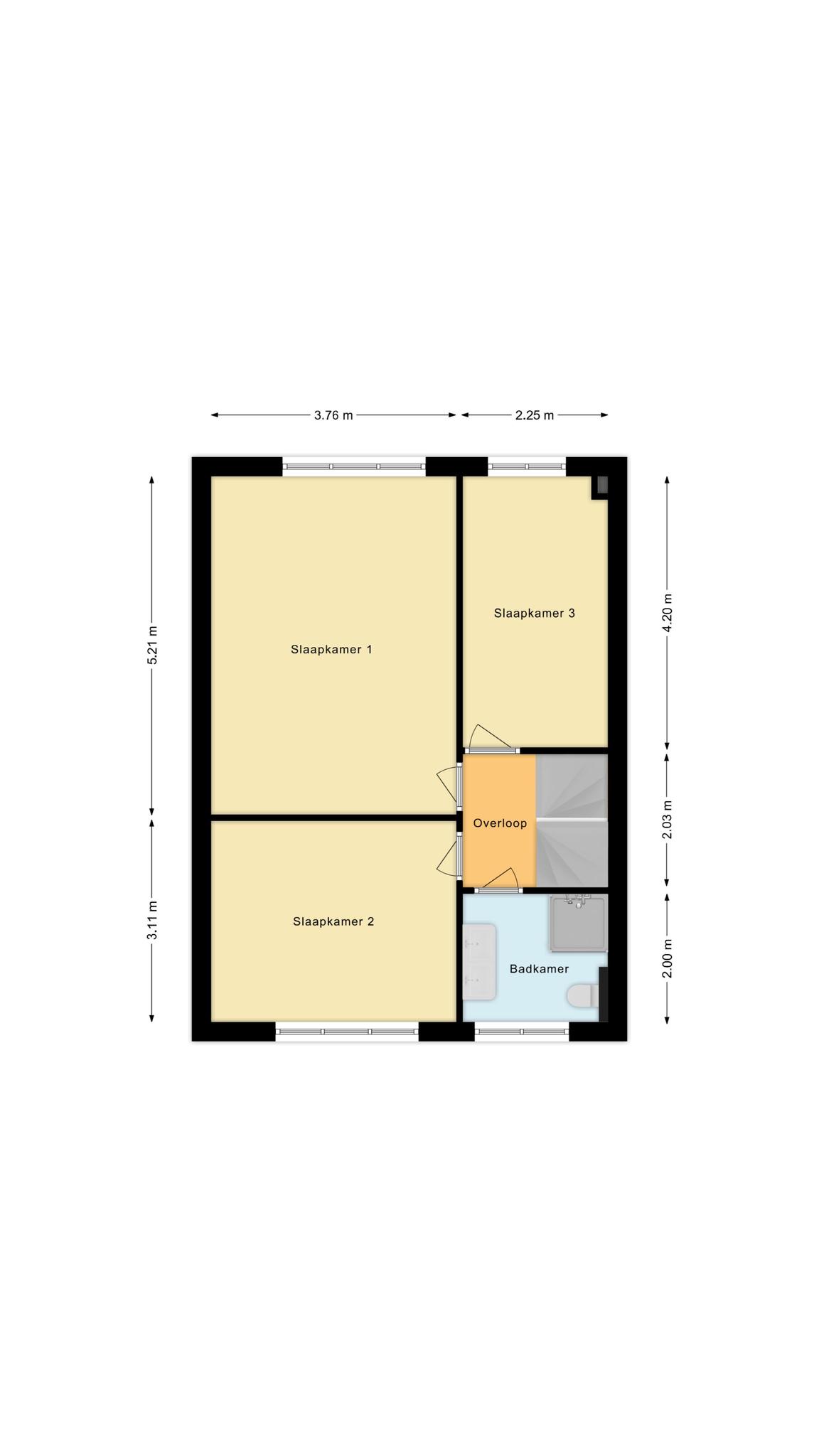 Op de verdieping de overloop; drie lichte slaapkamers en badkamer voorzien van douchecabine, dubbele wastafel en 2e toilet.