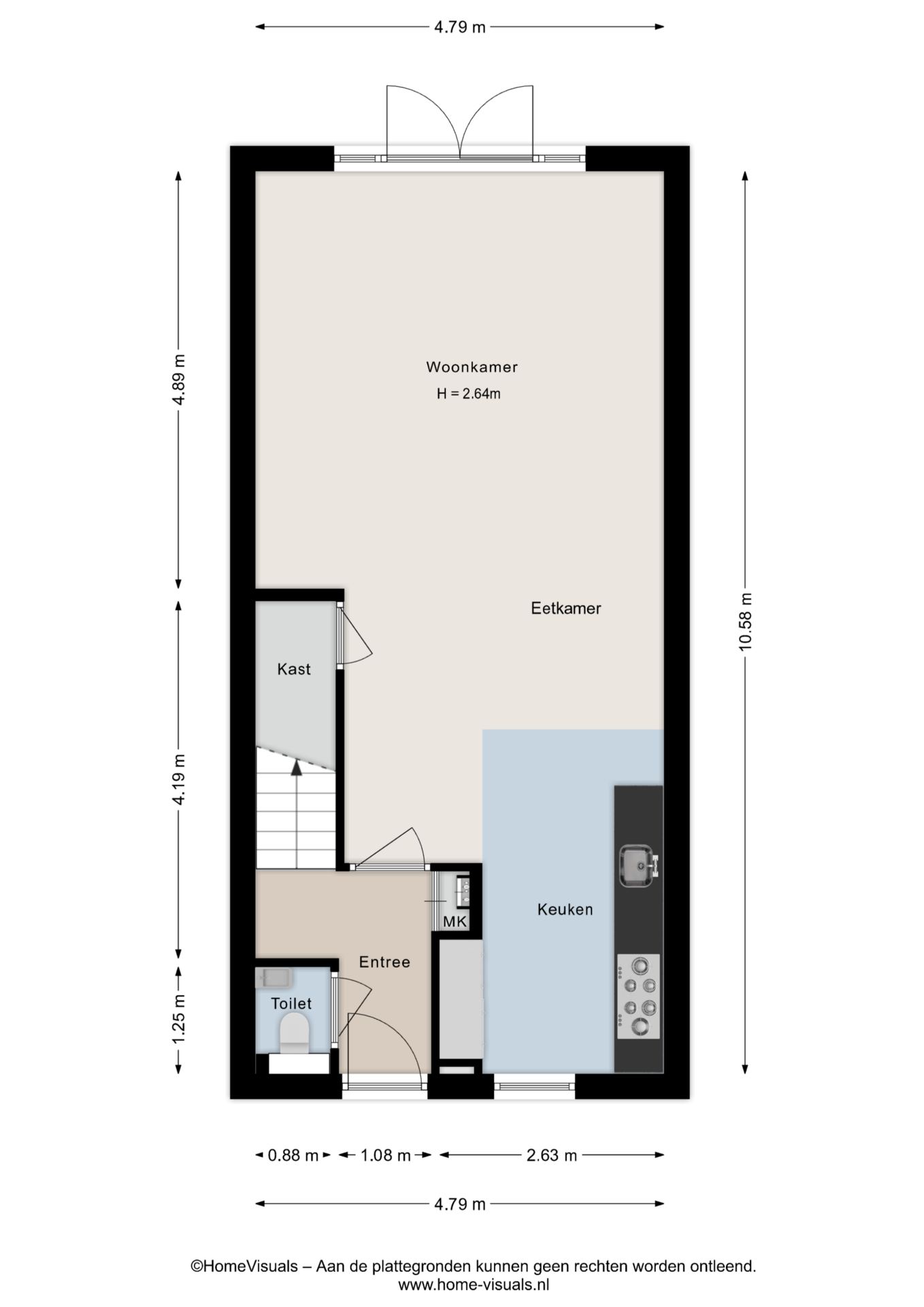 Begane grond: hal/entree met trapopgang, meterkast en toiletruimte met fontein. Uitgebouwde woonkamer met provisiekast en tuindeuren naar de achtertuin. De open keuken aan de voorzijde biedt veel werkruimte en is uitgerust met inbouwapparatuur van Bosch en Siemens, waaronder een koelkast, vriezer, stoomoven, oven, 5 -pits gaskookplaat, koffiezetapparaat met servieswarmer en vaatwasser. De begane grond is voorzien van vloerverwarming.