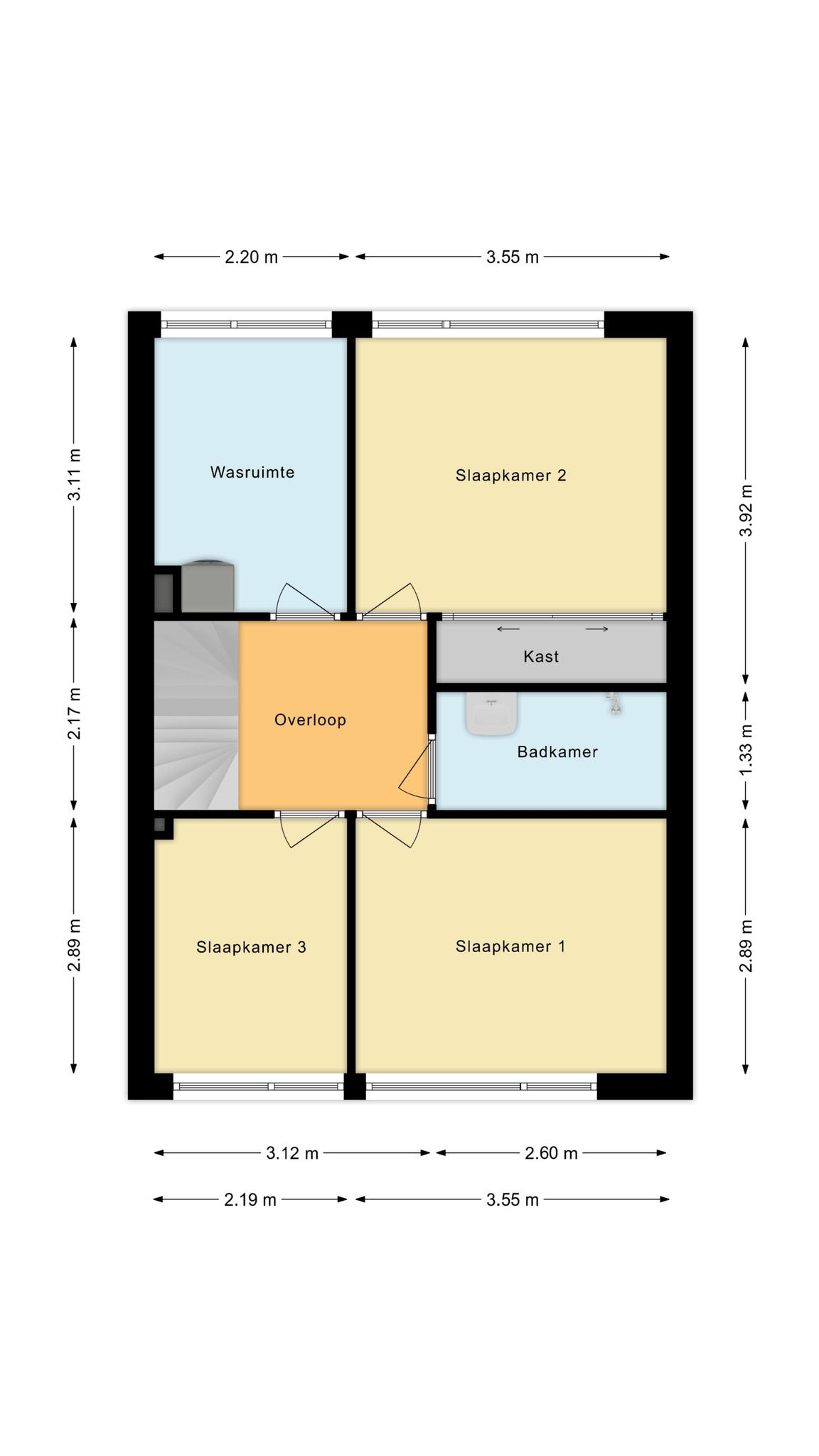 Op de verdieping een overloop, drie slaapkamers, een waskamer en een badkamer met douche en wastafel.