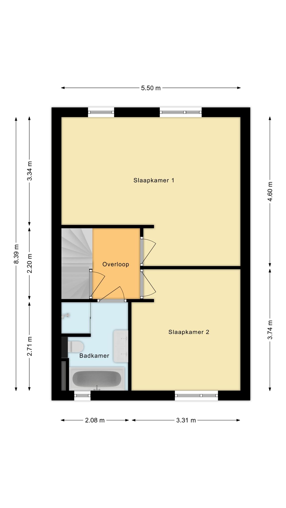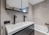 Op de verdieping een overloop, twee slaapkamers en een badkamer met ligbad, inloopdouche, dubbele wastafel met meubel en toilet. De hoofdslaapkamer kan, indien gewenst, weer opgesplitst worden naar twee kleinere kamers.