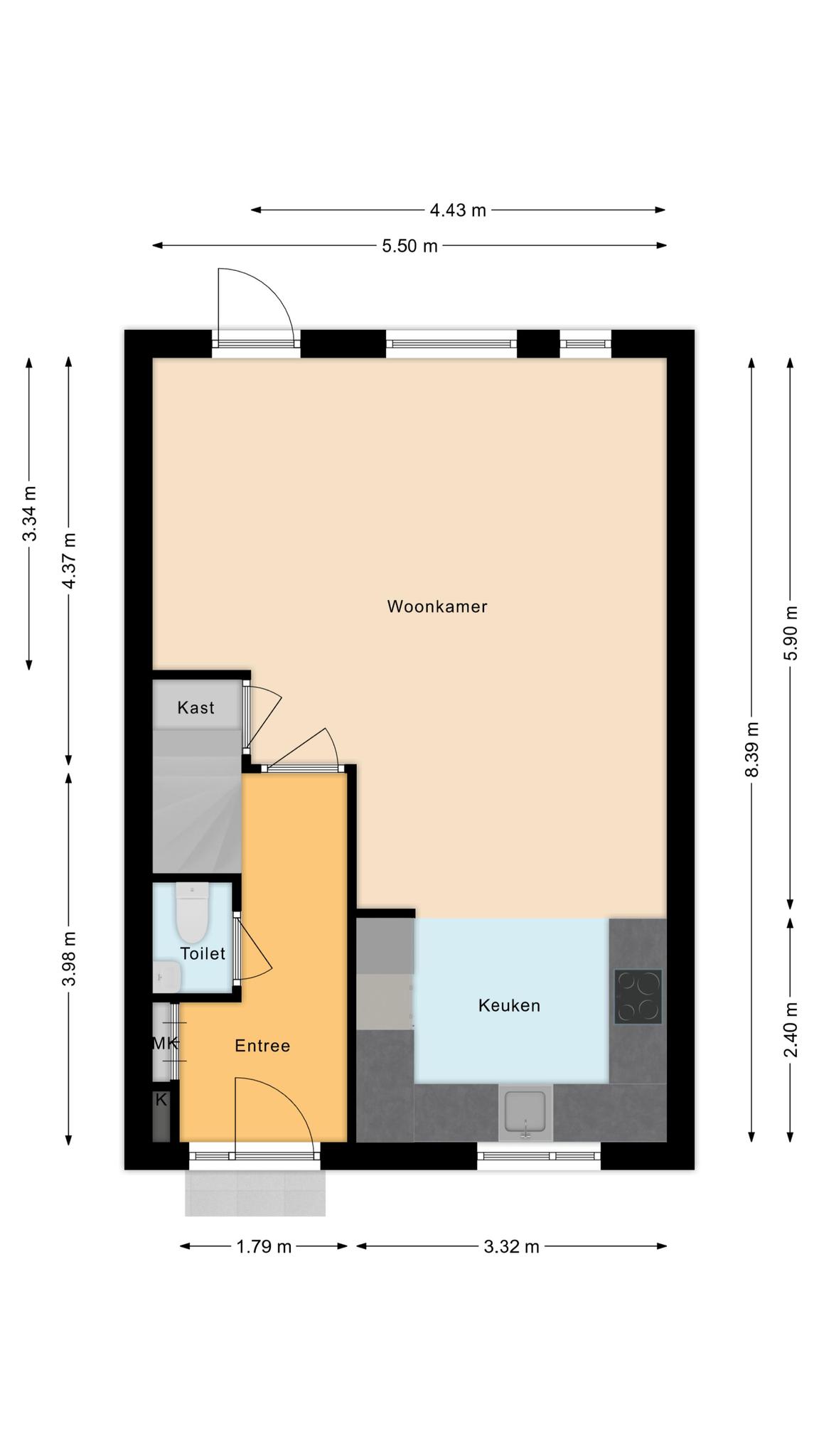 Begane grond o.a. hal/entree, vernieuwde toiletruimte; meterkast en trapopgang; Lichte woonkamer met achterom naar de tuin; open keuken uit 2022 voorzien van diverse inbouwapparatuur.