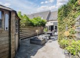 Achter het huis is het heerlijk vertoeven in de zonnige tuin, welke gelegen is op het oosten. De achtertuin met sierbestrating is omzoomd door schuttingen en borders met beplanting. De tuin is via een achter omgang bereikbaar en tenslotte voor de woning een eigen oprit, aangebouwde stenen berging en de entree van de woning.