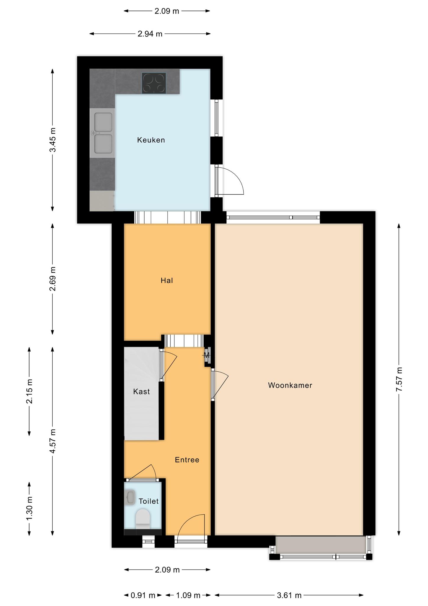 De entree is voorzien van een vaste kast, toilet, meterkast en de trapopgang. Vanuit de entree is de ruime woonkamer bereikbaar, waar ook ruimte is voor een eethoek. De halfopen keuken is eveneens via de entree toegankelijk en is uitgerust met een kookplaat, afzuigkap, vaatwasser en een dubbele spoelbak. Vanuit de keuken is er toegang tot de achtertuin, die is gelegen op het oosten. In de tuin staat een vrijstaande houten berging en er is tevens een achterom aanwezig.