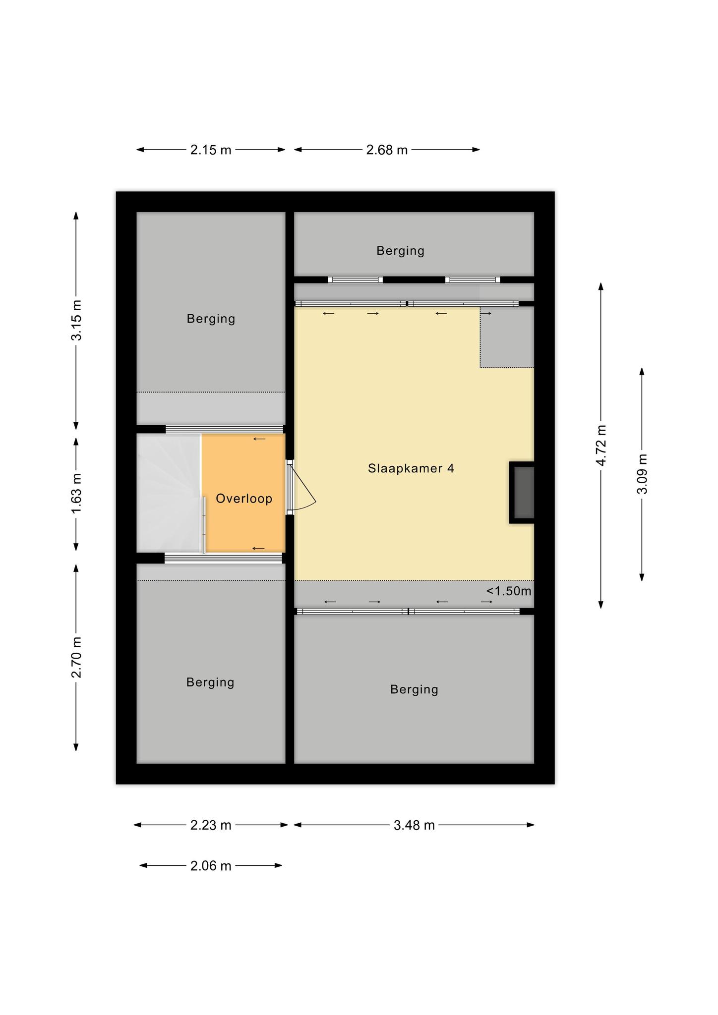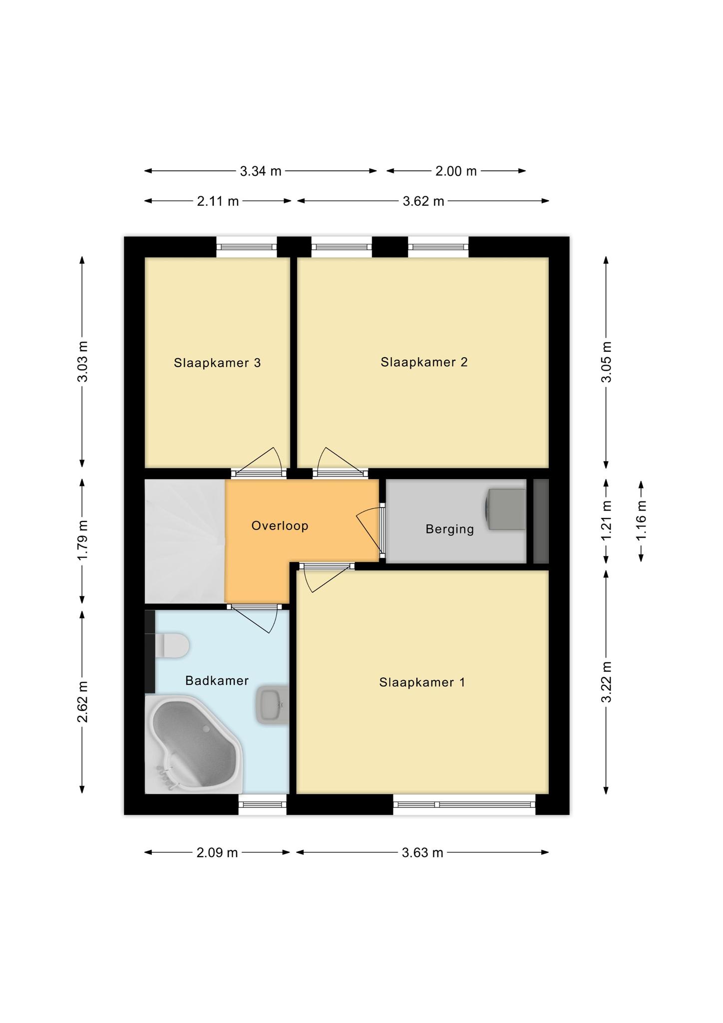 Op de eerste verdieping bevinden zich drie slaapkamers, een berging/wasruimte met witgoedaansluiting en de badkamer die voorzien is van een toilet, wastafel en badmeubel. De tweede verdieping beschikt over veel vaste kasten die ideaal zijn voor extra bergruimte. Daarnaast is er op deze verdieping nog een slaapkamer aanwezig. Deze kamer is multifunctioneel te gebruiken en kan ook dienen als kantoor of hobbyruimte.