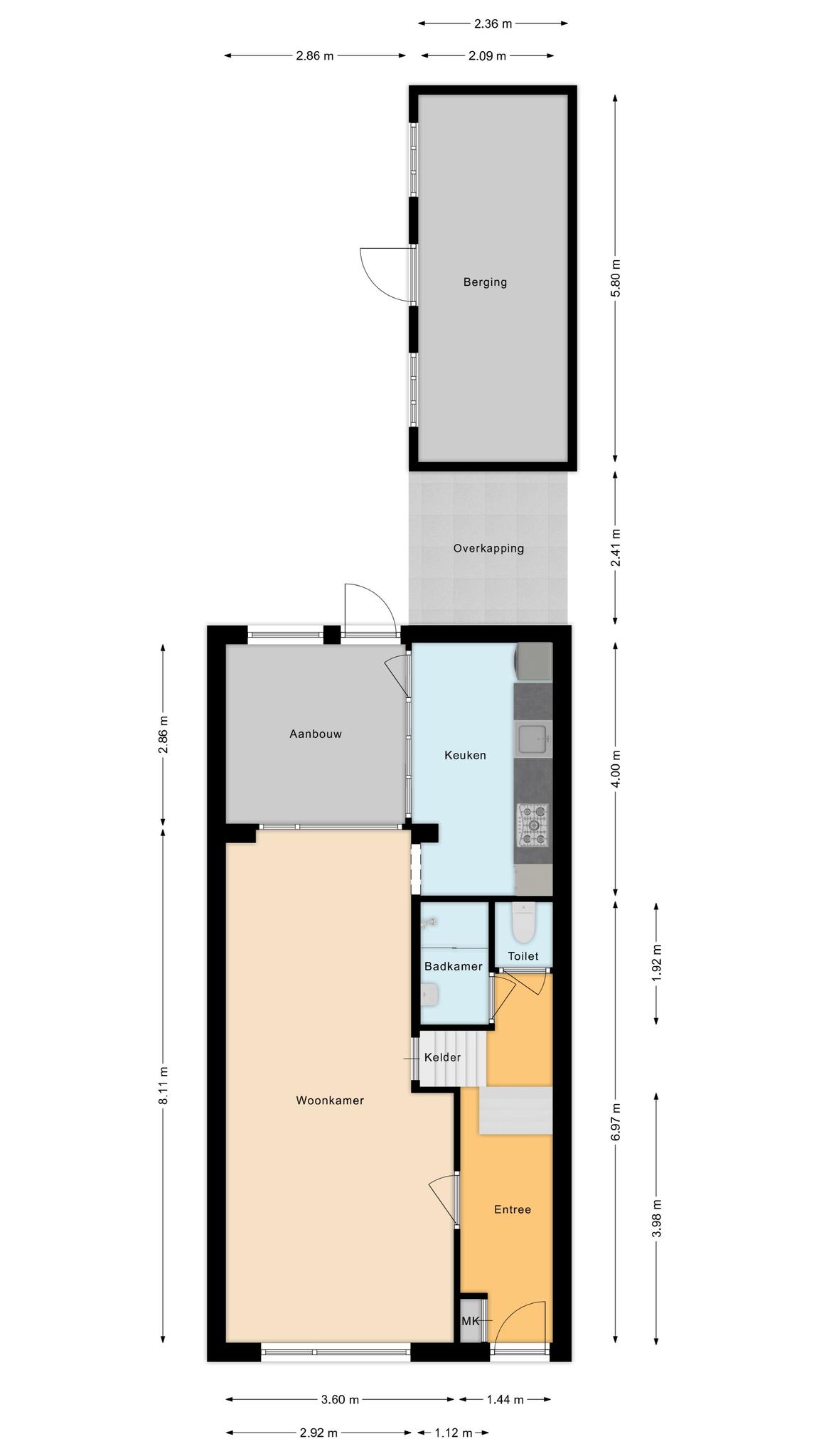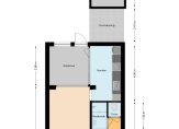 Op de begane grond de entree met meterkast, toiletruimte, trapopgang en de badkamer v.v. douche en wastafel; doorzonwoonkamer met toegang tot de kelder; dichte keukenruimte in neutrale keukenopstelling v.v. gaskookplaat, afzuigkap, combioven, vaatwasser, koelkast en de aansluiting voor de wasmachine; vanuit de keuken tevens toegang tot de uitbouw.