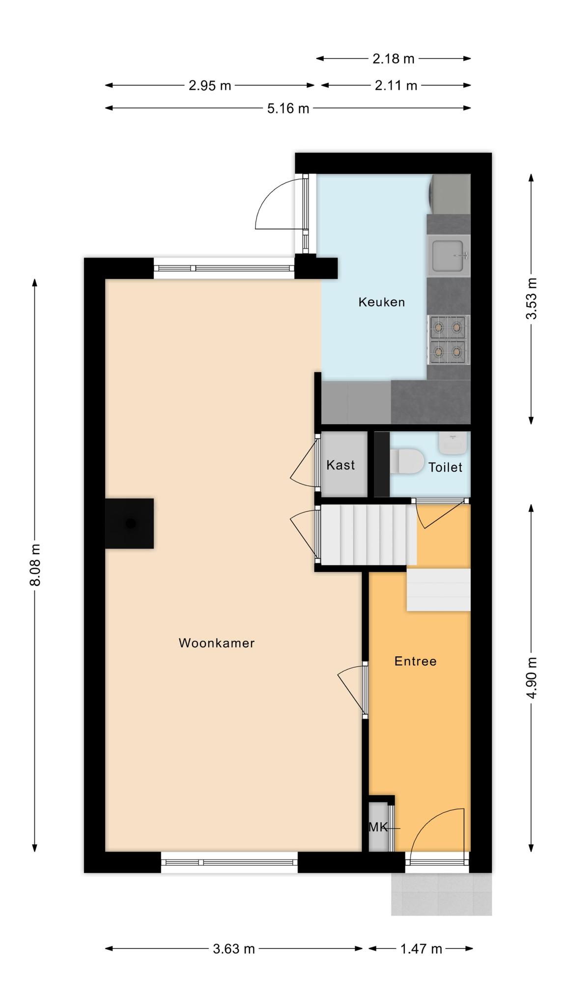– Hal/entree met trapopgang en toiletruimte (hang + fontein);