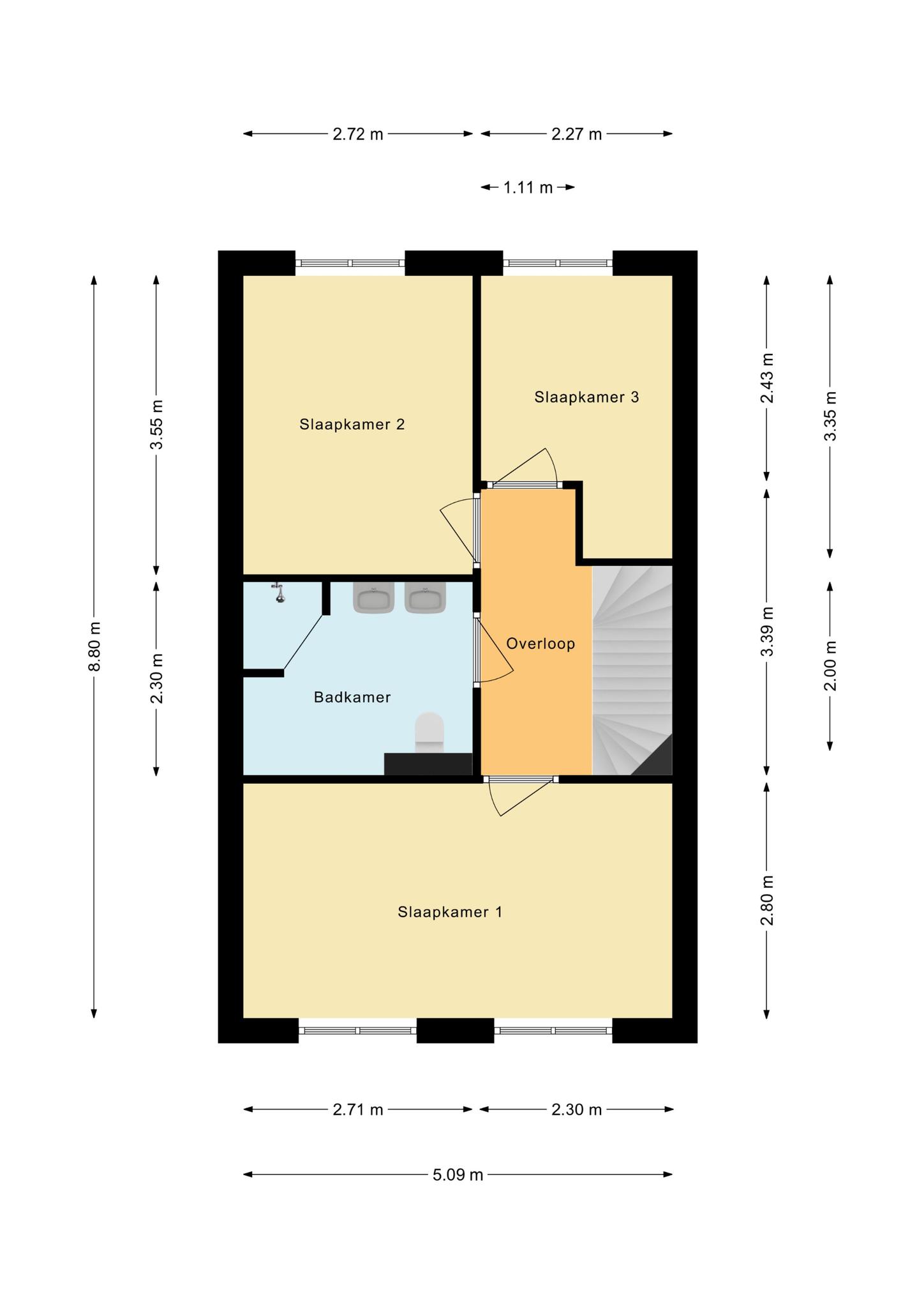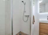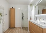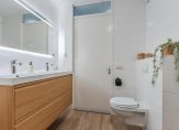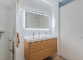 Op de eerste verdieping de overloop, drie slaapkamers waarvan de hoofdslaapkamer over de volledige breedte van de woning en een moderne badkamer uit 2024 met een inloopdouche, wastafelmeubel en tweede toilet.