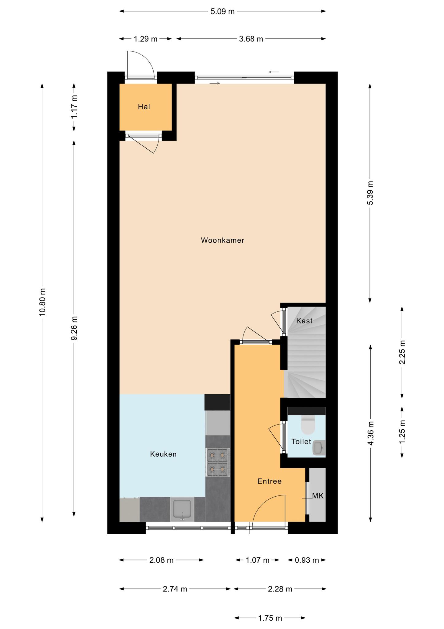 Binnenkomst via de hal/entree met trapopgang, meterkast en toiletruimte (2024). De ruime woonkamer is voorzien van een afgesloten hal met achterom naar de tuin. Aan de straatzijde bevindt zich de moderne open keuken, uitgerust met diverse inbouwapparatuur zoals een vaatwasser, combi-oven, gaskookplaat en koelkast.