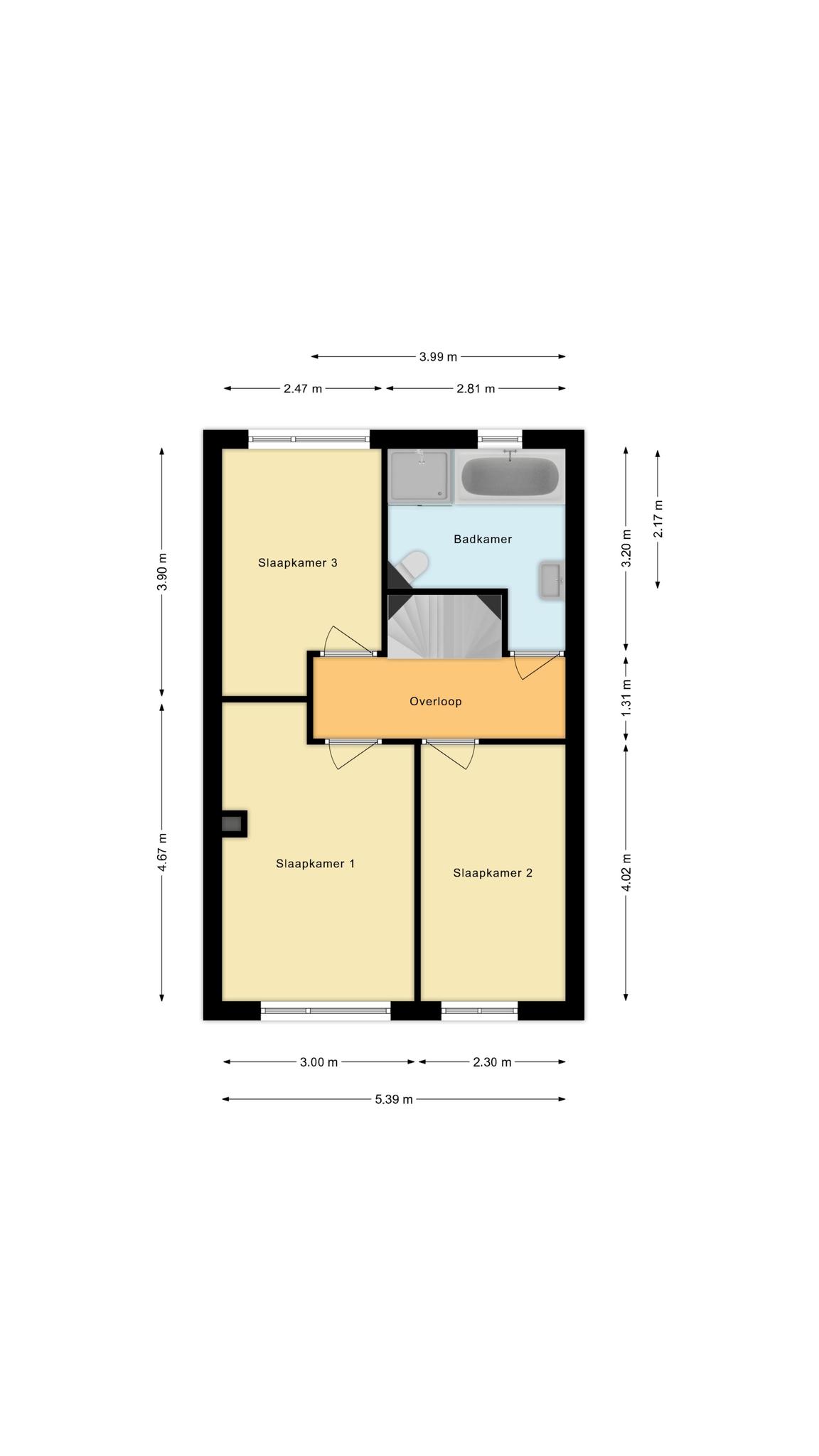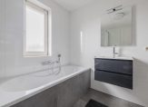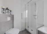 Op de eerste verdieping drie slaapkamers en een ruime badkamer met ligbad, douchecabine, 2e toilet en wastafelmeubel.