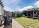 De fraai aangelegde achtertuin ligt op het zuiden en beschikt over sierbestrating, groene borders, een gazon en vijver over de gehele breedte van de tuin. Achterin de tuin staat een royale overkapping, ideaal voor gezellige avonden buiten. Aan de voorzijde is voldoende ruimte voor meerdere auto’s op eigen terrein.