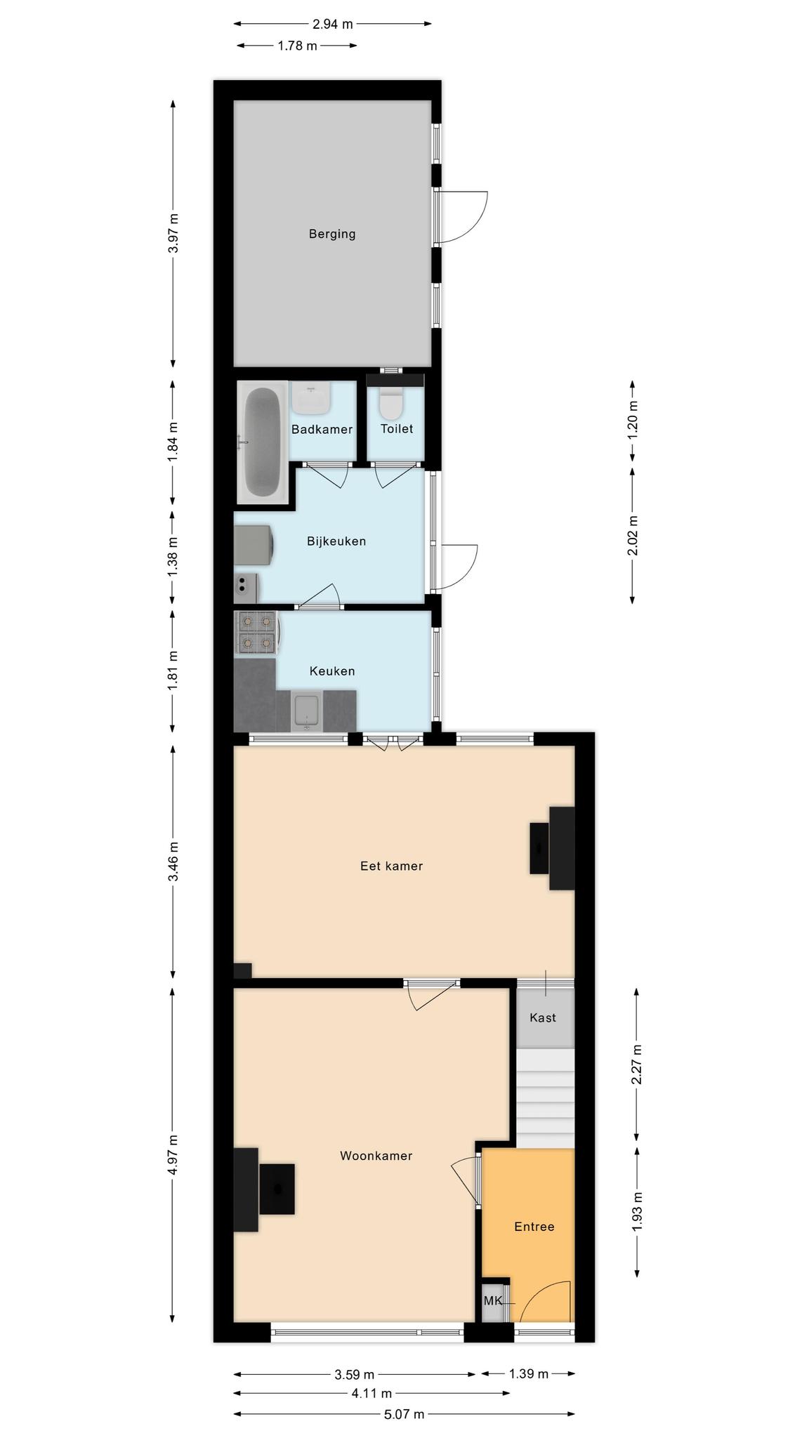Via de voordeur kom je binnen in de entree met meterkast. Vanuit daar loop je door naar de woonkamer met daarop aansluitend de eetkamer. De keuken ligt aan de achterzijde van de woning en is verbonden met de bijkeuken. Achterin bevinden zich de badkamer en een apart toilet. Op de verdieping een overloop, toiletruimte, drie slaapkamers en opbergruimte achter de schuine kanten.