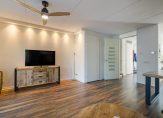 – Woonkamer met provisiekast en tuindeur die toegang biedt tot de overkapping en de achtertuin;