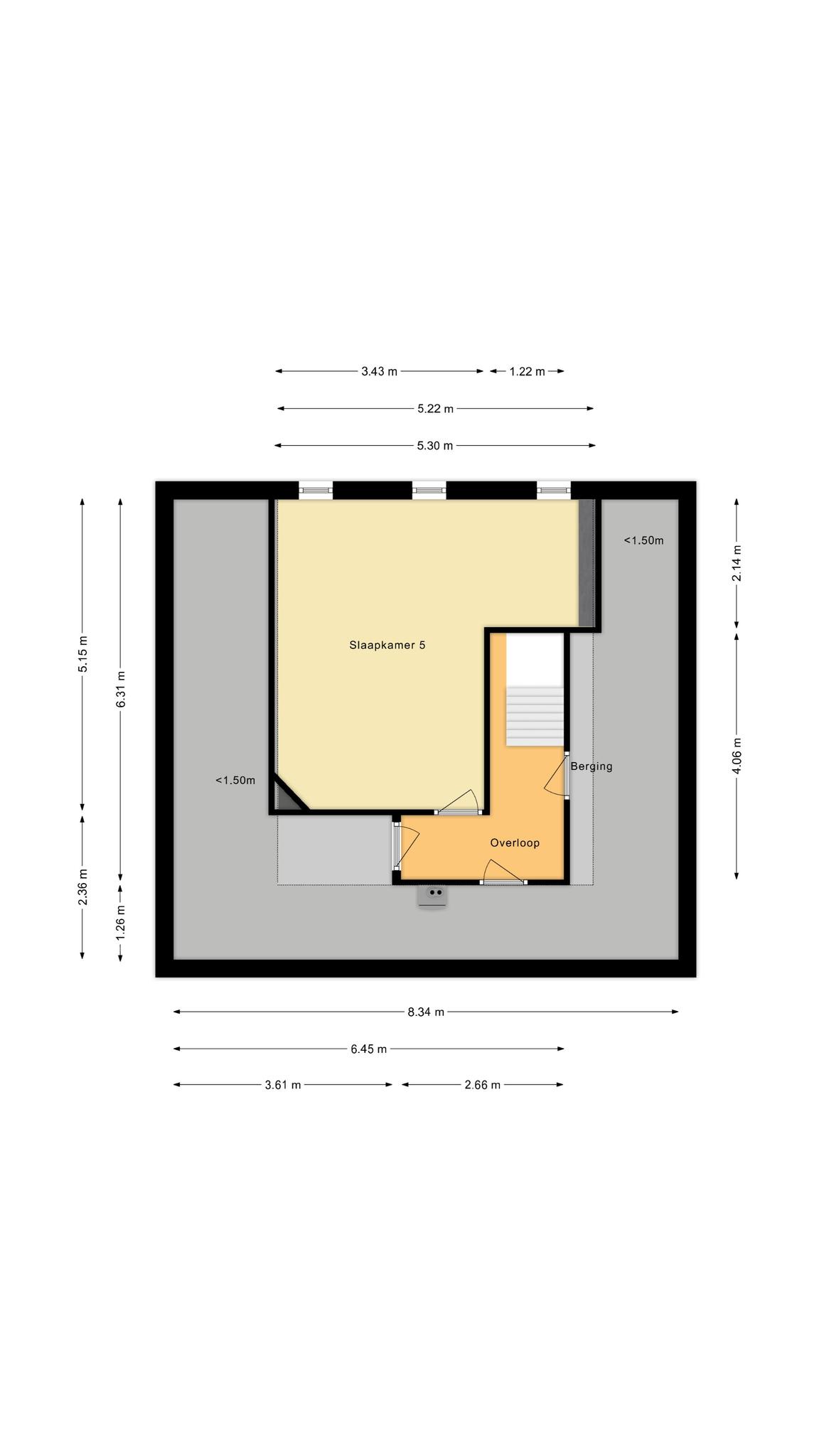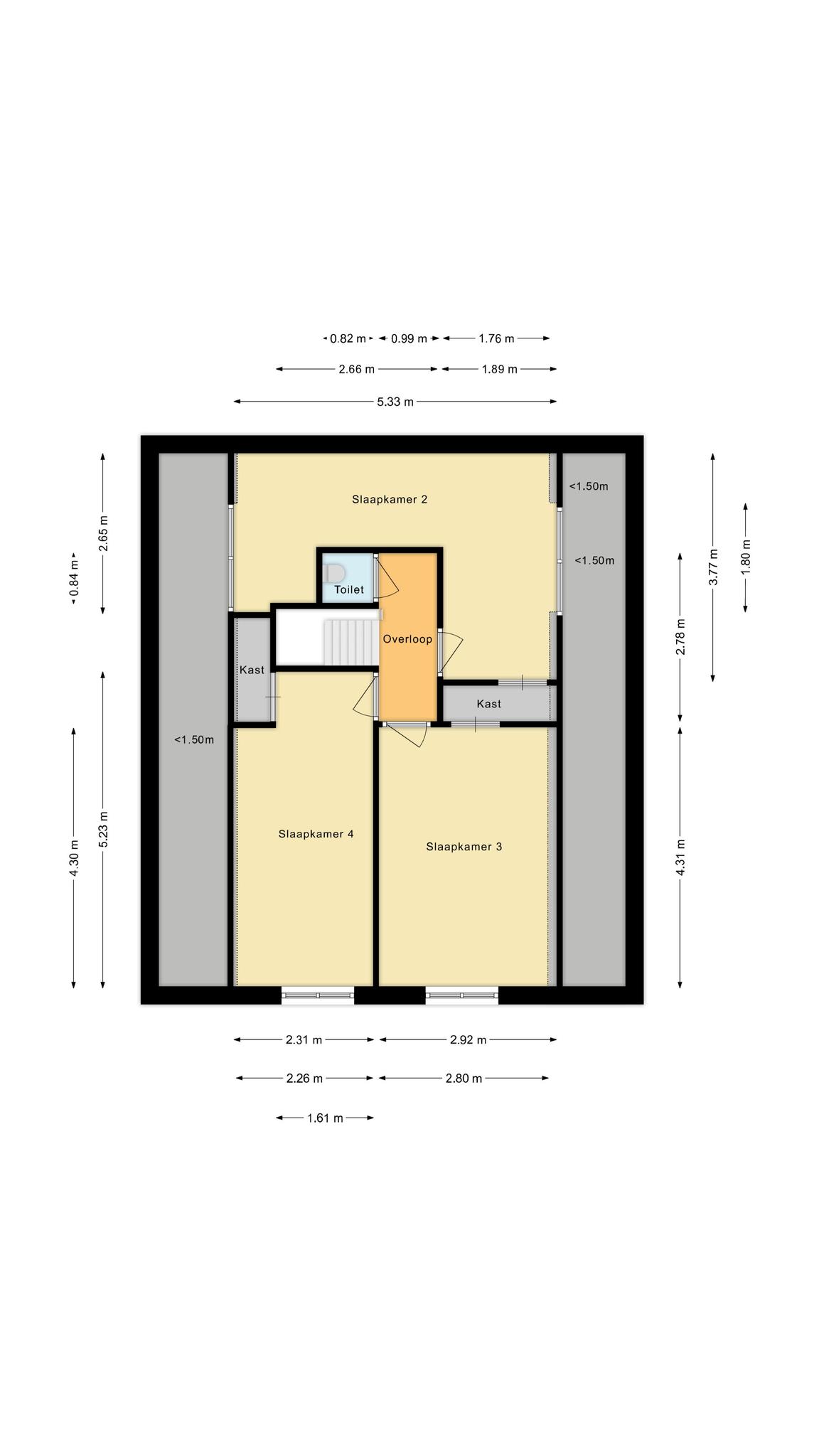 Op de verdieping aan de voorzijde van de woning een vaste trap naar de overloop en 3 (slaap)kamers, allemaal met vaste kastruimte. Aan de achterzijde van de woning wederom een vaste trap naar een overloop met toegang tot een berging/stookruimte en een 5e (slaap)kamer.