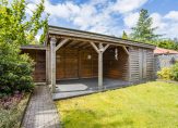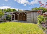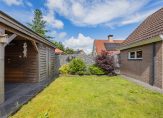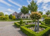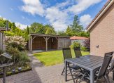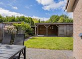 Aan de voorzijde beschikt de woning over een nette voortuin met gazon, beplanting en eigen oprit. De achtertuin is gesitueerd op het zuidwesten, fraai aangelegd, voorzien van een terras en een overkapping met berging. De achtertuin is bereikbaar via de garage.