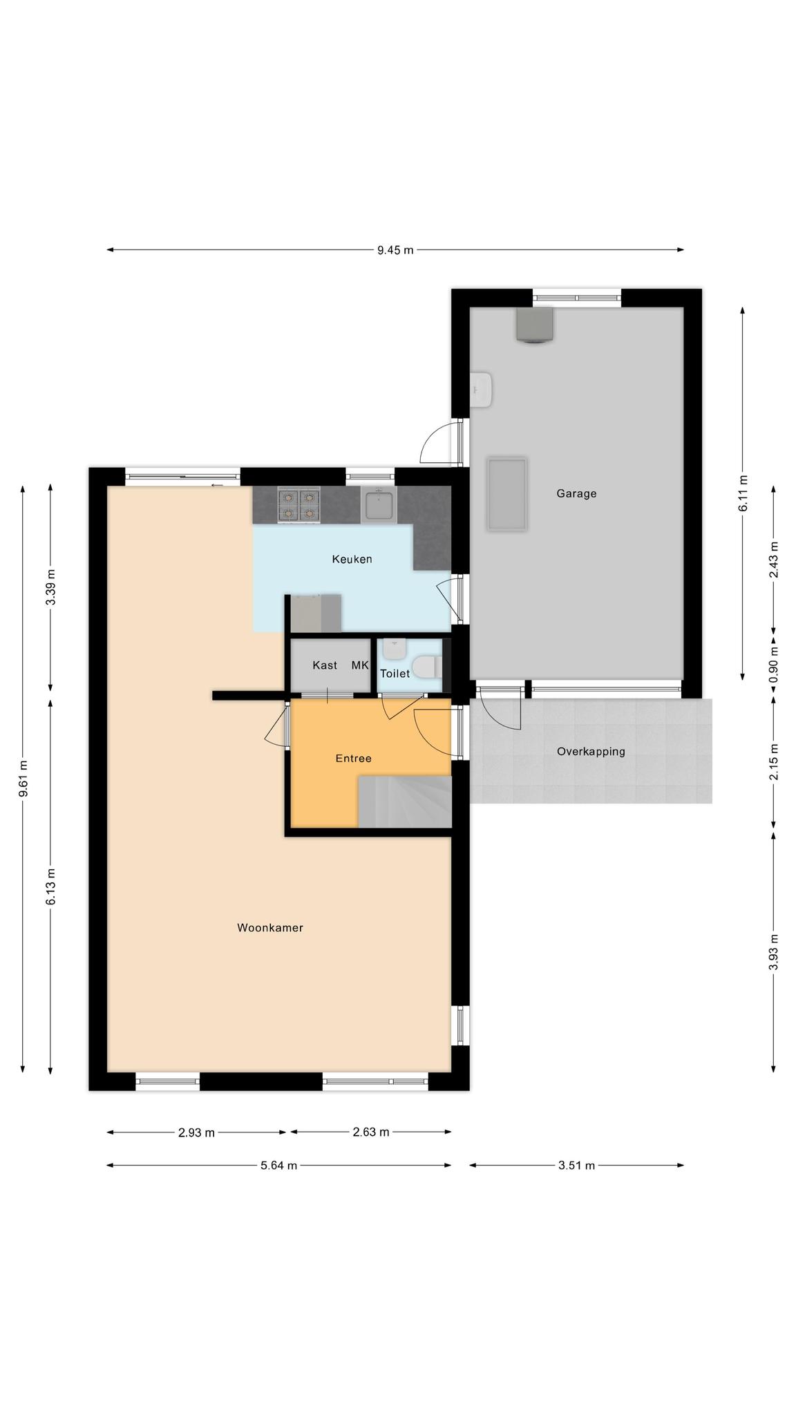 Op de begane grond o.a. hal / entree met toiletruimte en trapopgang; L-vormige woonkamer met eethoek, schuifpui en een open keuken met hoekkeuken v.v. inbouwapparatuur en deur naar de garage; Garage is voorzien van een verdieping, verwarming, aansluiting voor de wasmachine/droger en verder is er ruimte voor 1 auto;
