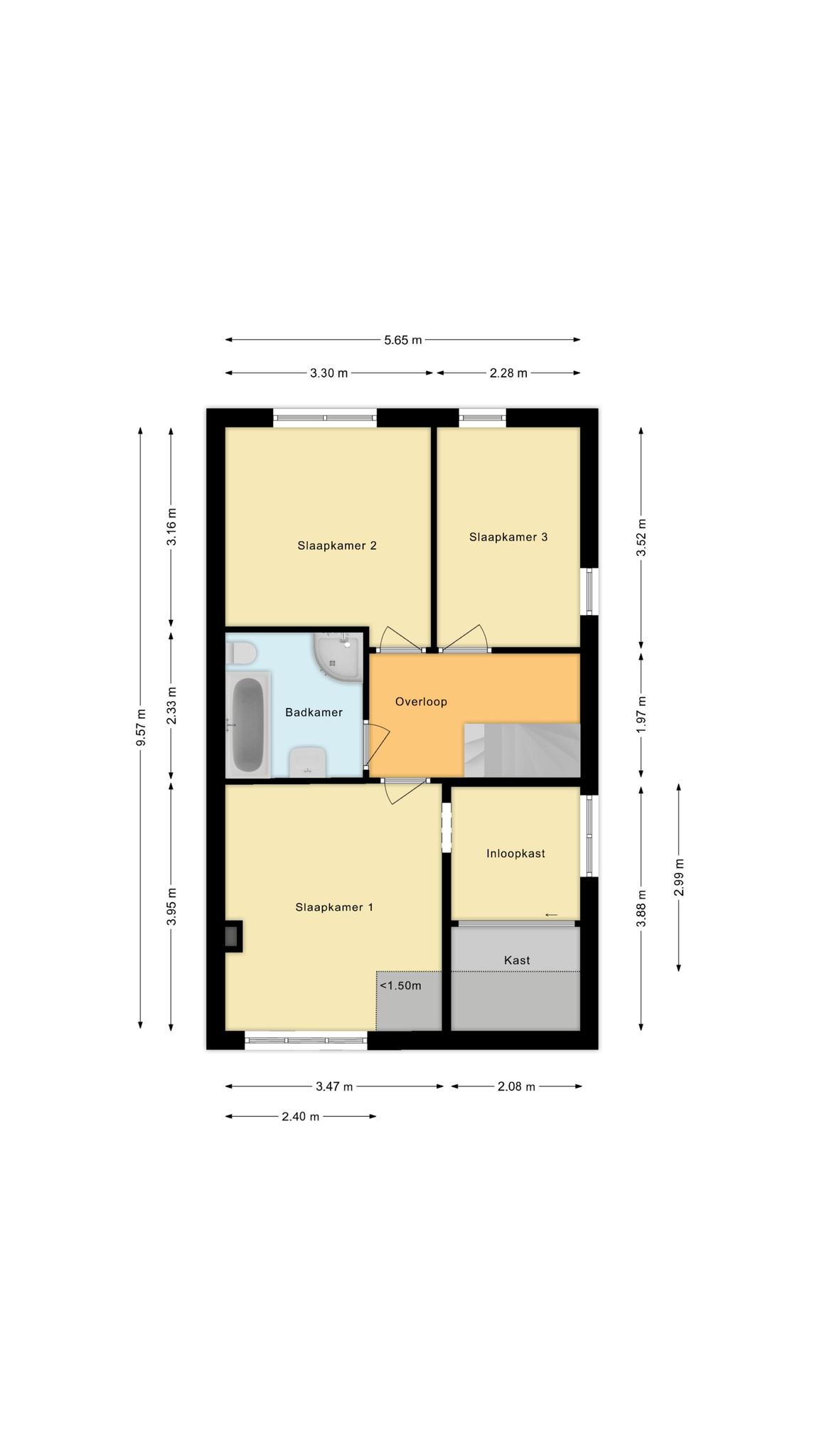 Op de verdieping een overloop, drie slaapkamers en een inpandige badkamer voorzien van 2e toilet, douchecabine, ligbad en wastafelmeubel.