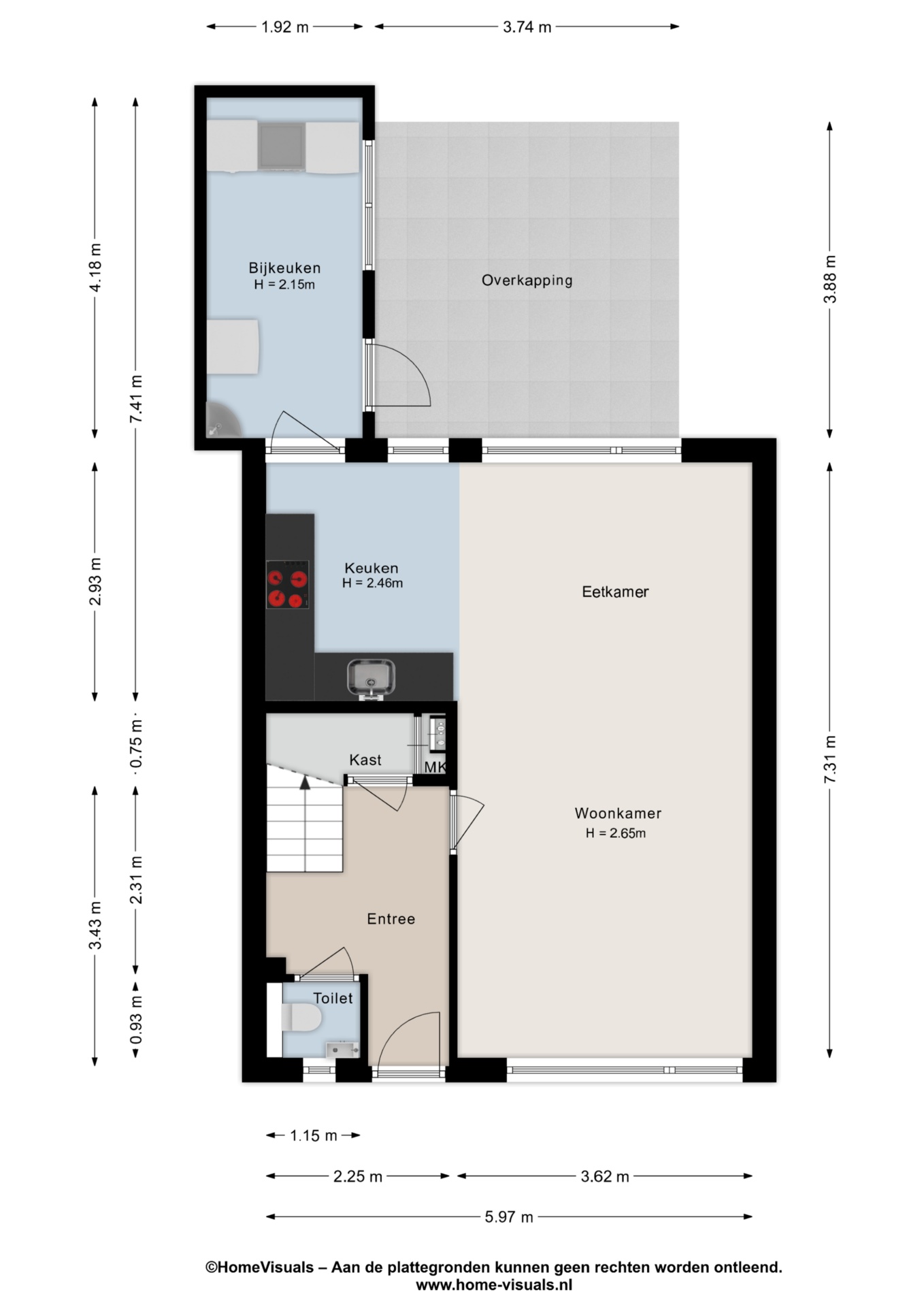 Begane grond: Entree, toilet, trapopgang. Doorzon woonkamer, open keuken met inbouwapparatuur. Bijkeuken met wasmachineaansluiting.