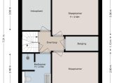 Eerste verdieping: Overloop met vaste trap naar tweede verdieping, 3 slaapkamers, badkamer met douche, toilet en wastafel.