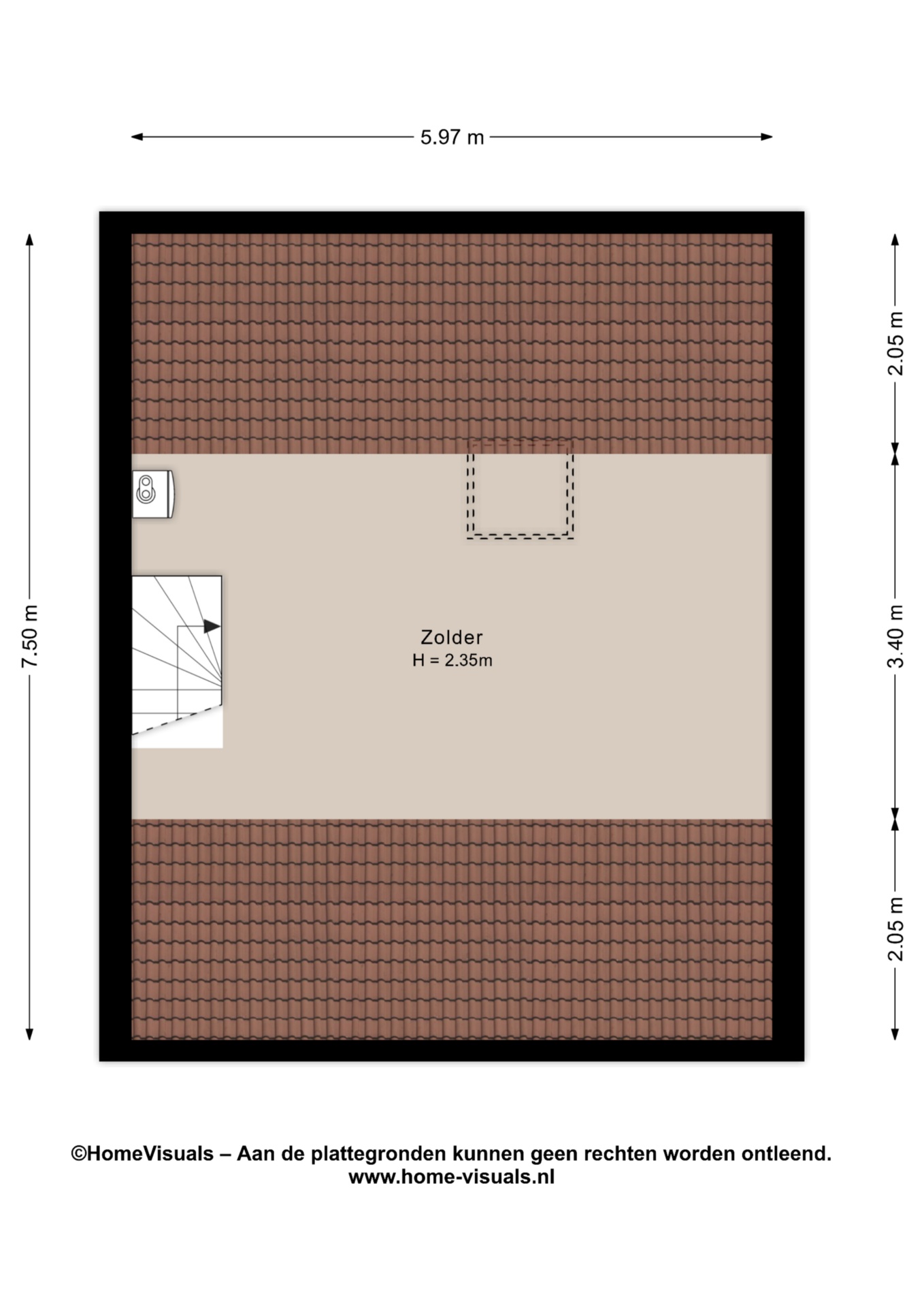 Tweede verdieping: Grote zolder, vrij in te delen.